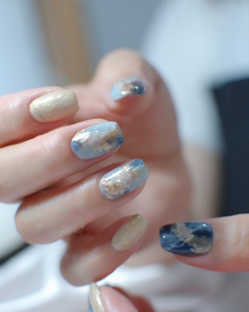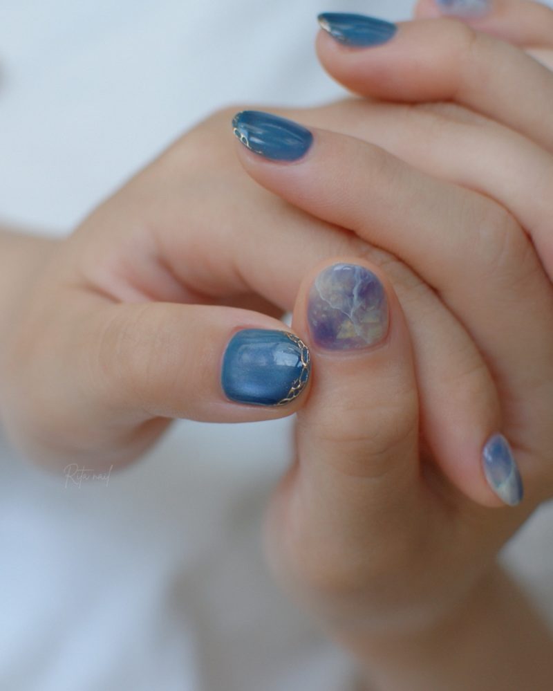 深めのブルーにマグネットの艶と、天然石風アートがアクセント。