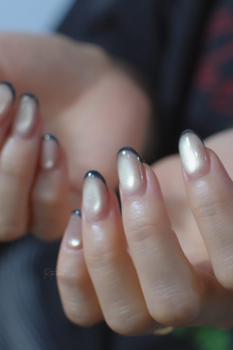シャンパンゴールドのマグネットネイルに、先端だけネイビーラインを効かせたシックなデザイン。