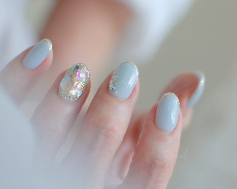 淡い水色に、ラメラインと埋め込みビジューがきらり。